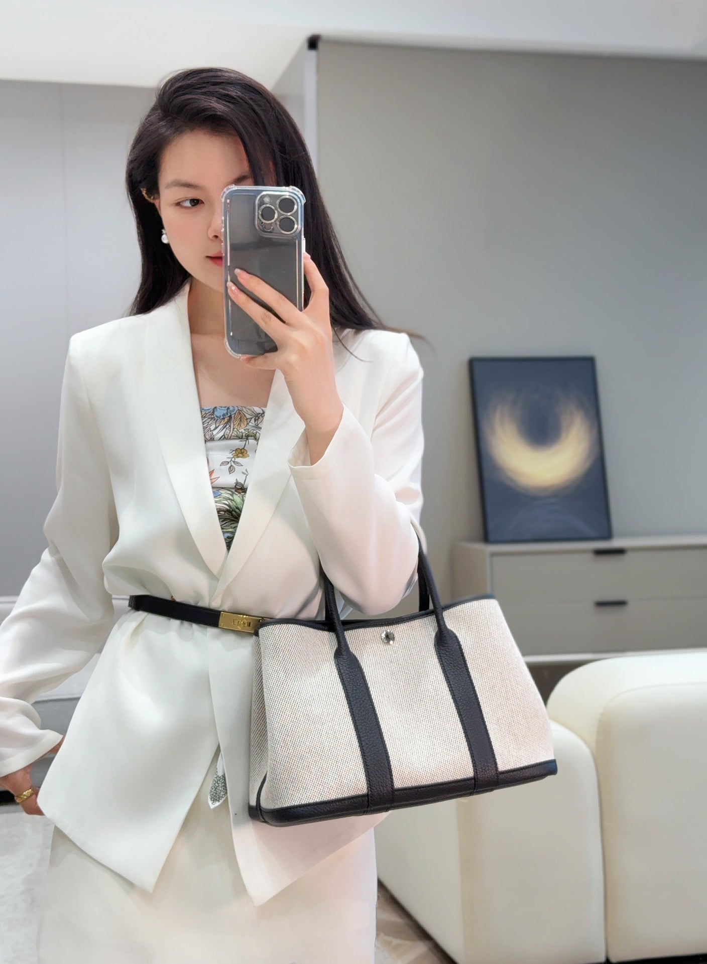 GARDEN PARTY 30CM IN WHITE TOILETS COTTON CANVAS AND BLACK CALFSKIN BLUE CANVAS ON SIDE OTHER