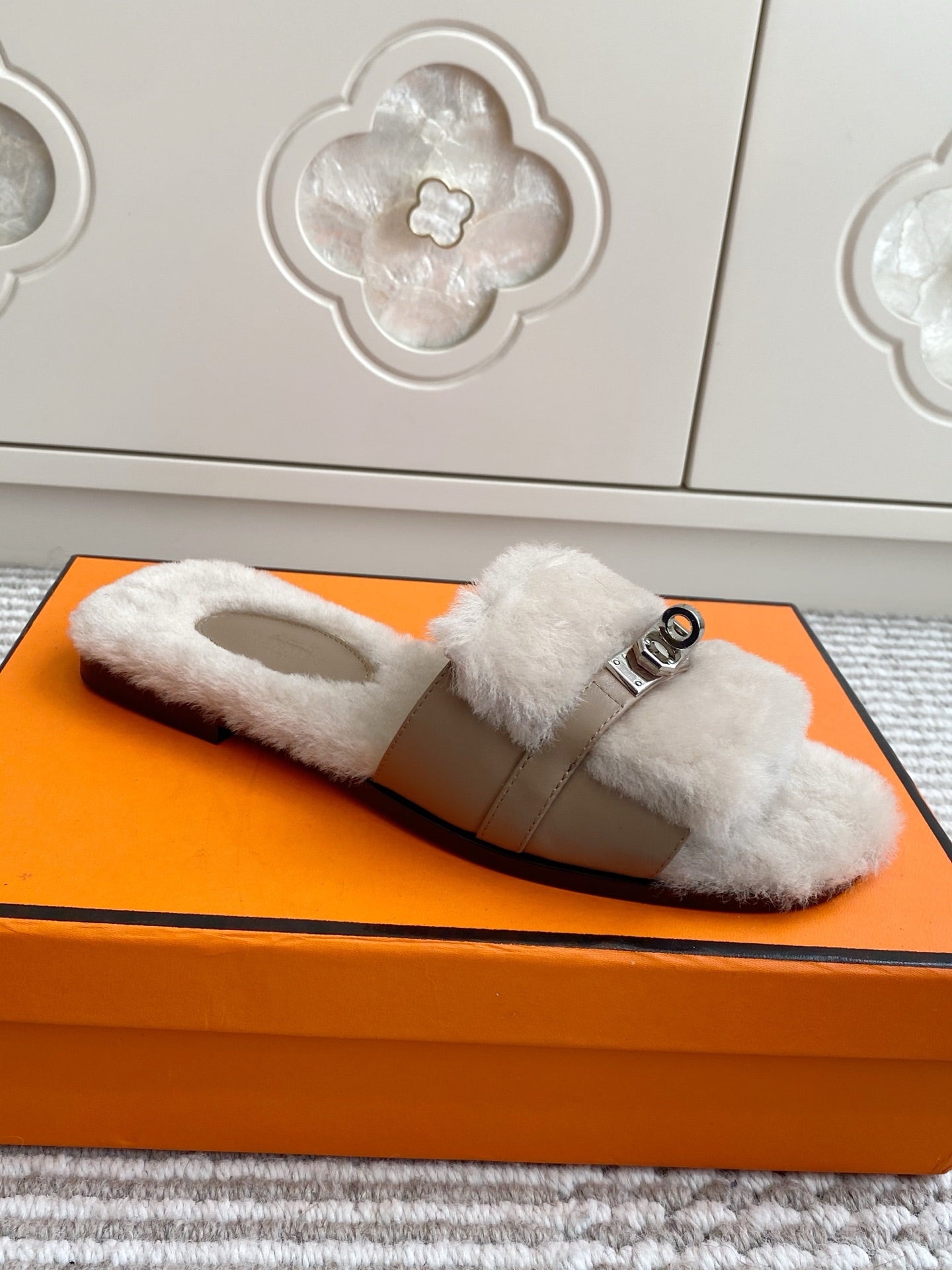 HM 25S GIULIA SANDAL IN PALE BEIGE GRAY SHEARLING WITH SILVER HARDWARE