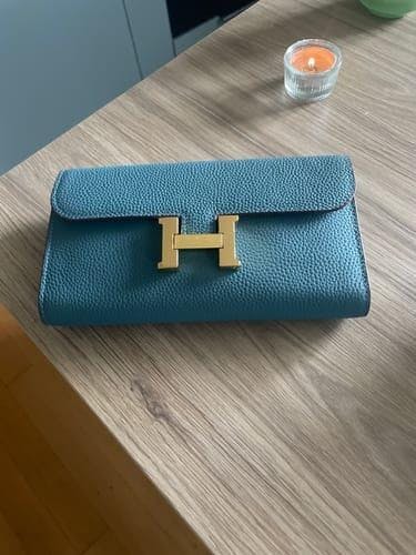 Beautiful Hermes clutch. The color is more beautiful in person. The stitching is perfect and I love the gold hardware.
