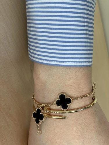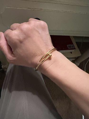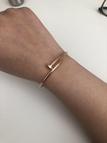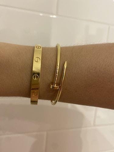 So happy with this JUC bracelet! For reference, my love bracelet in the photo is the real deal and the colour matches perfectly. The only thing to note is that the Juste In Clou is lightweight. Other than that, it is perfect.