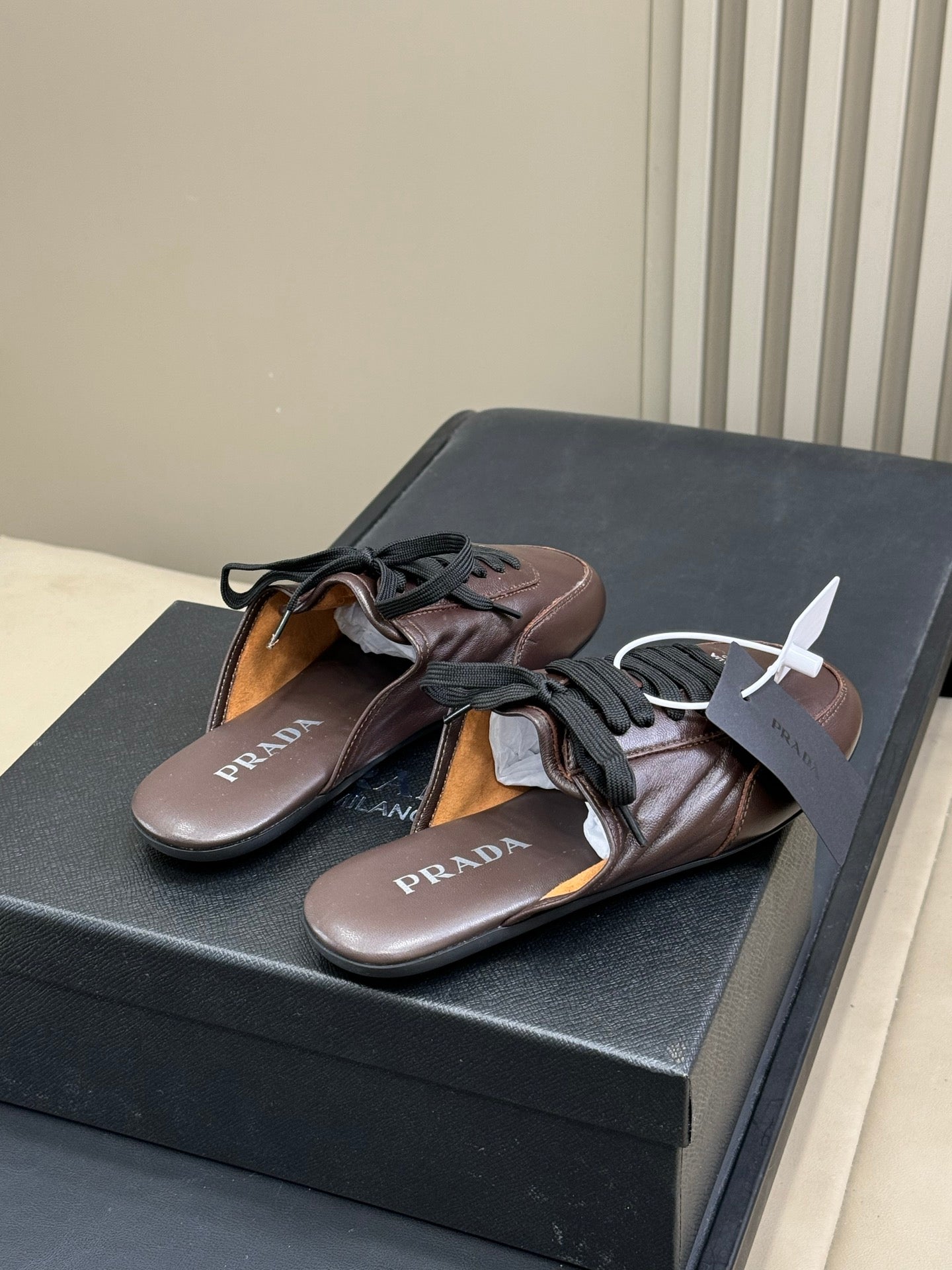 PRADA 25S COLLAPSE MULES IN DARK BROWN CALFSKIN