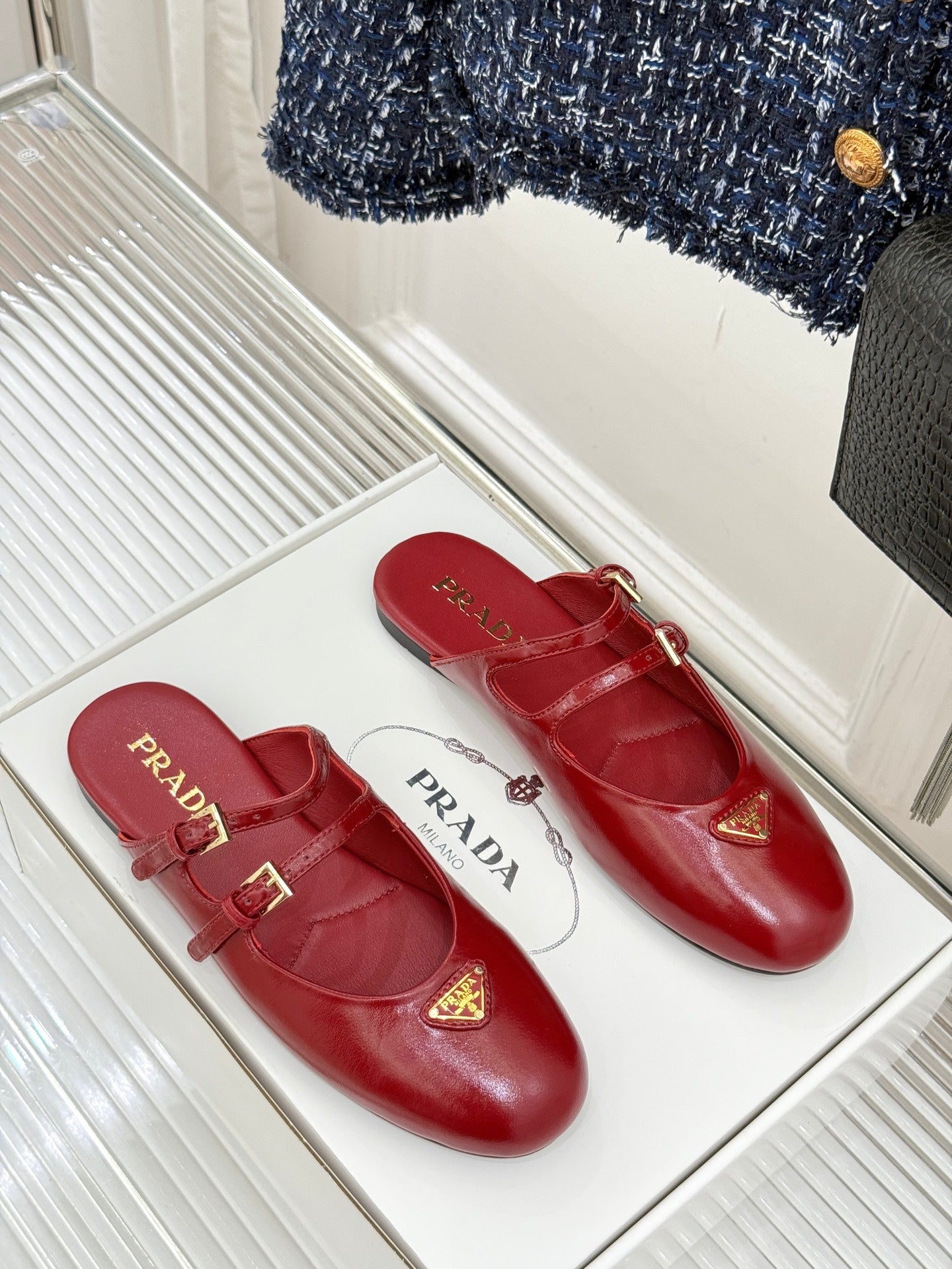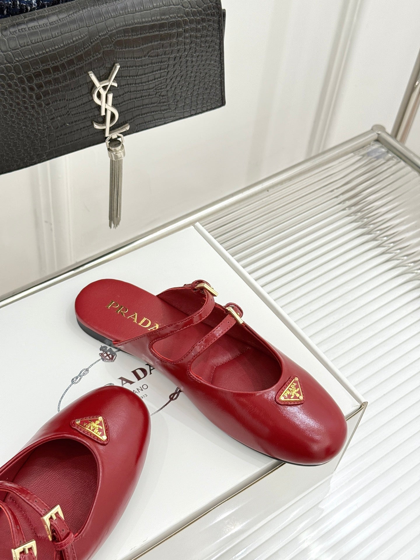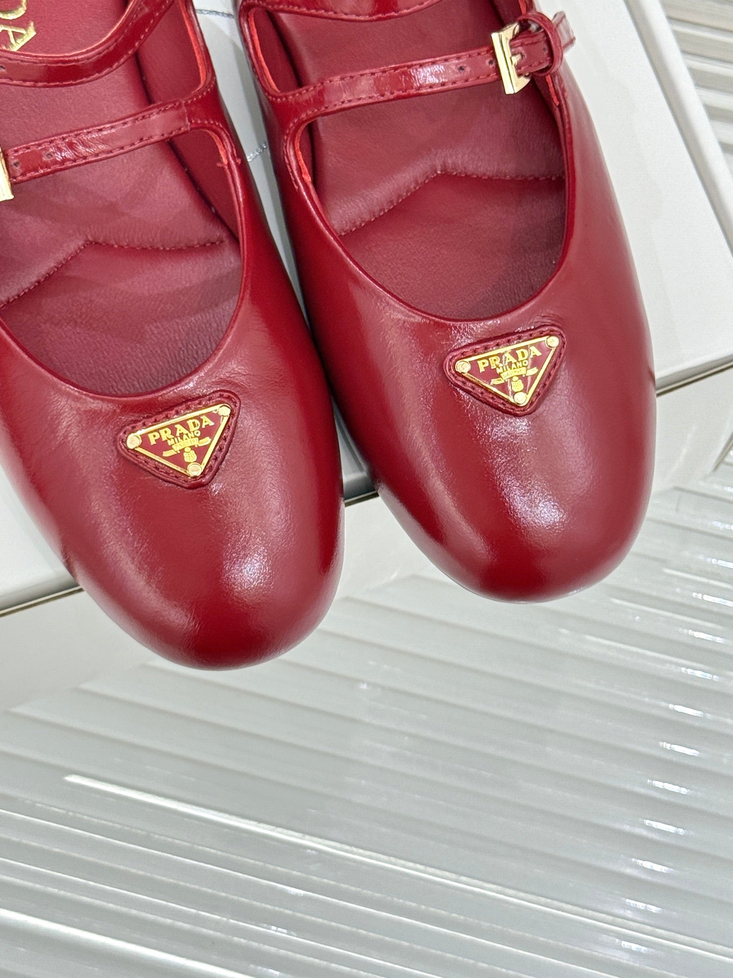PRADA 25S DUAL MARY JANE BALLERINA MULES IN RED WINE CALFSKIN