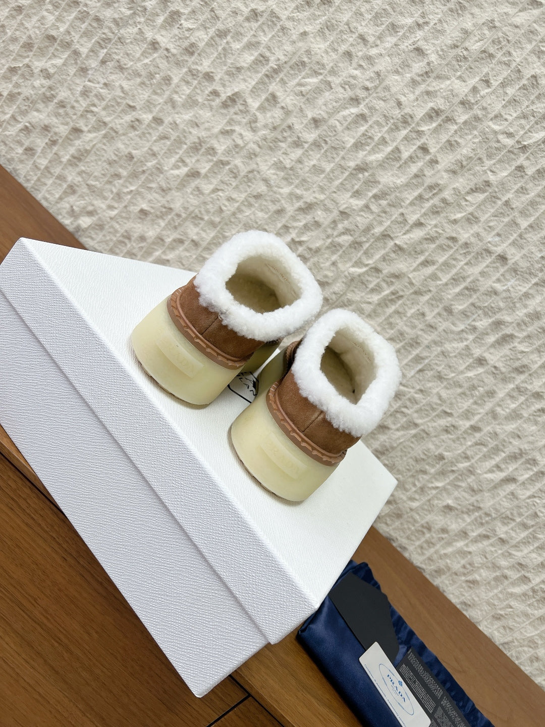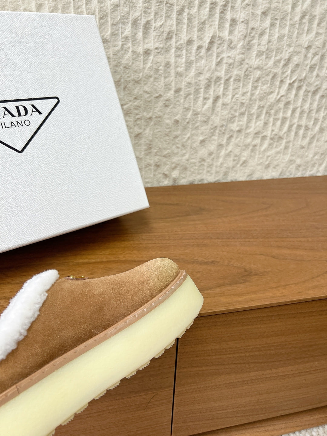 PRADA 25S PLATFORM FUR-LINED MULES IN BROWN SUEDE