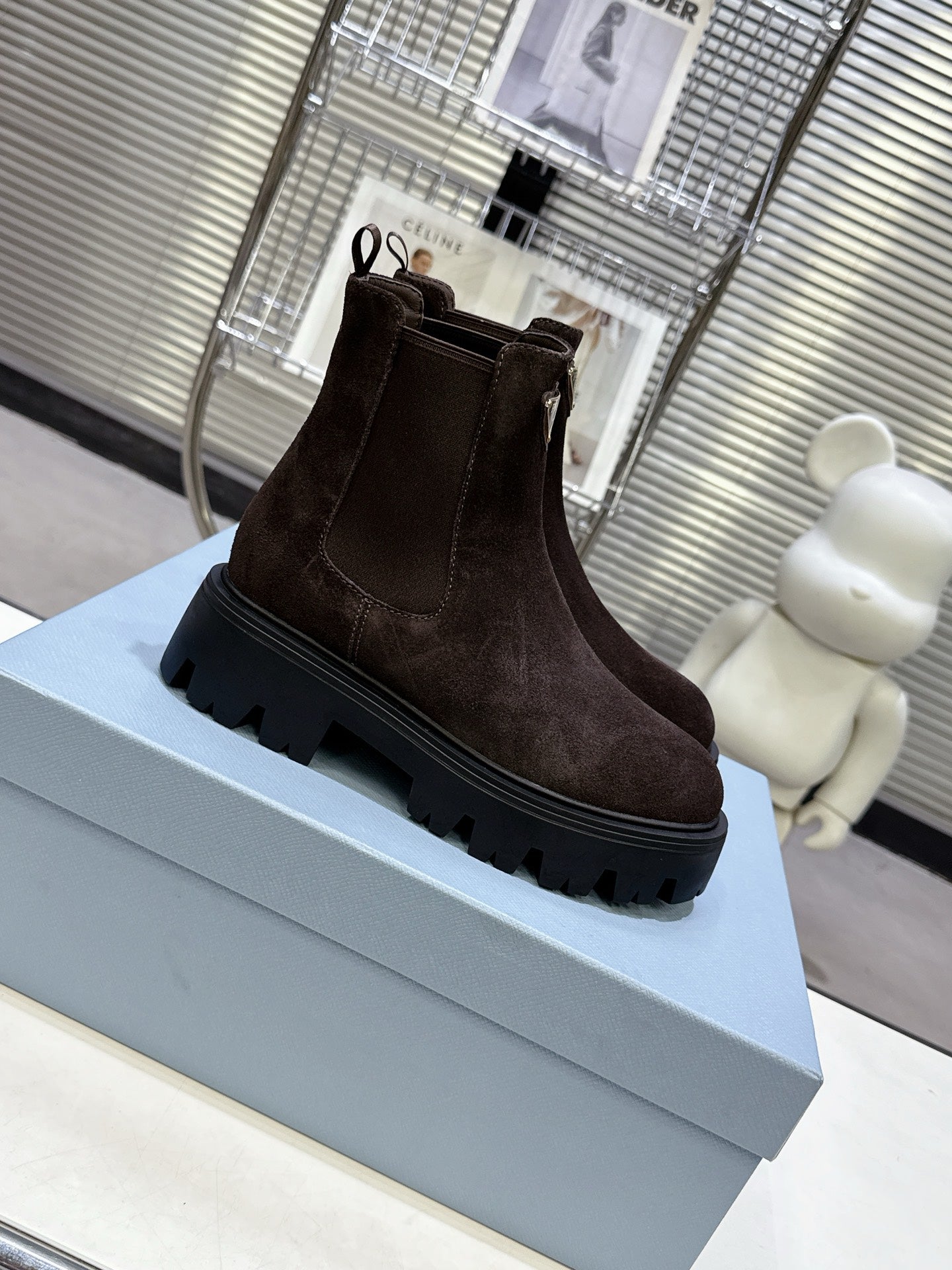 PRADA 25S RETRO PLATFORM MARTIN ANKLE BOOTS IN DARK BROWN SUEDE