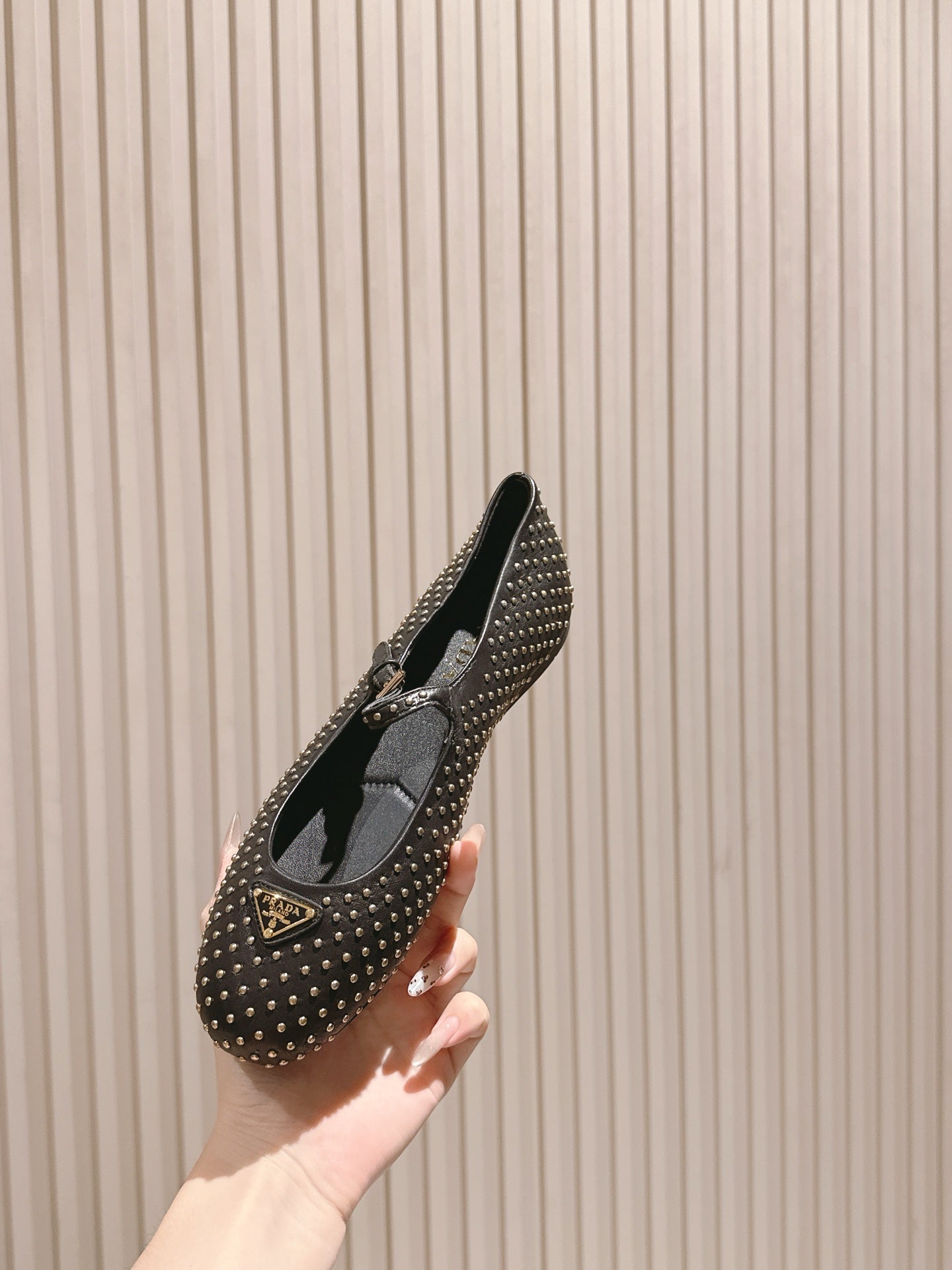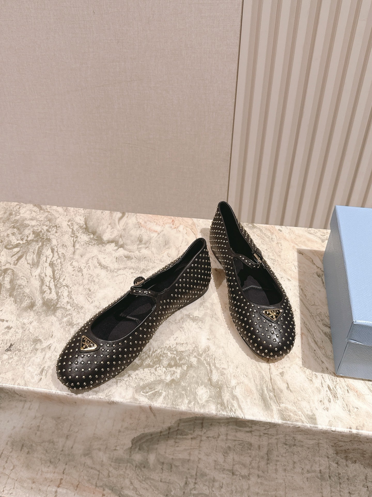 PRADA 25S STUD EMBELLISHED BALLERINA IN BLACK CALFSKIN