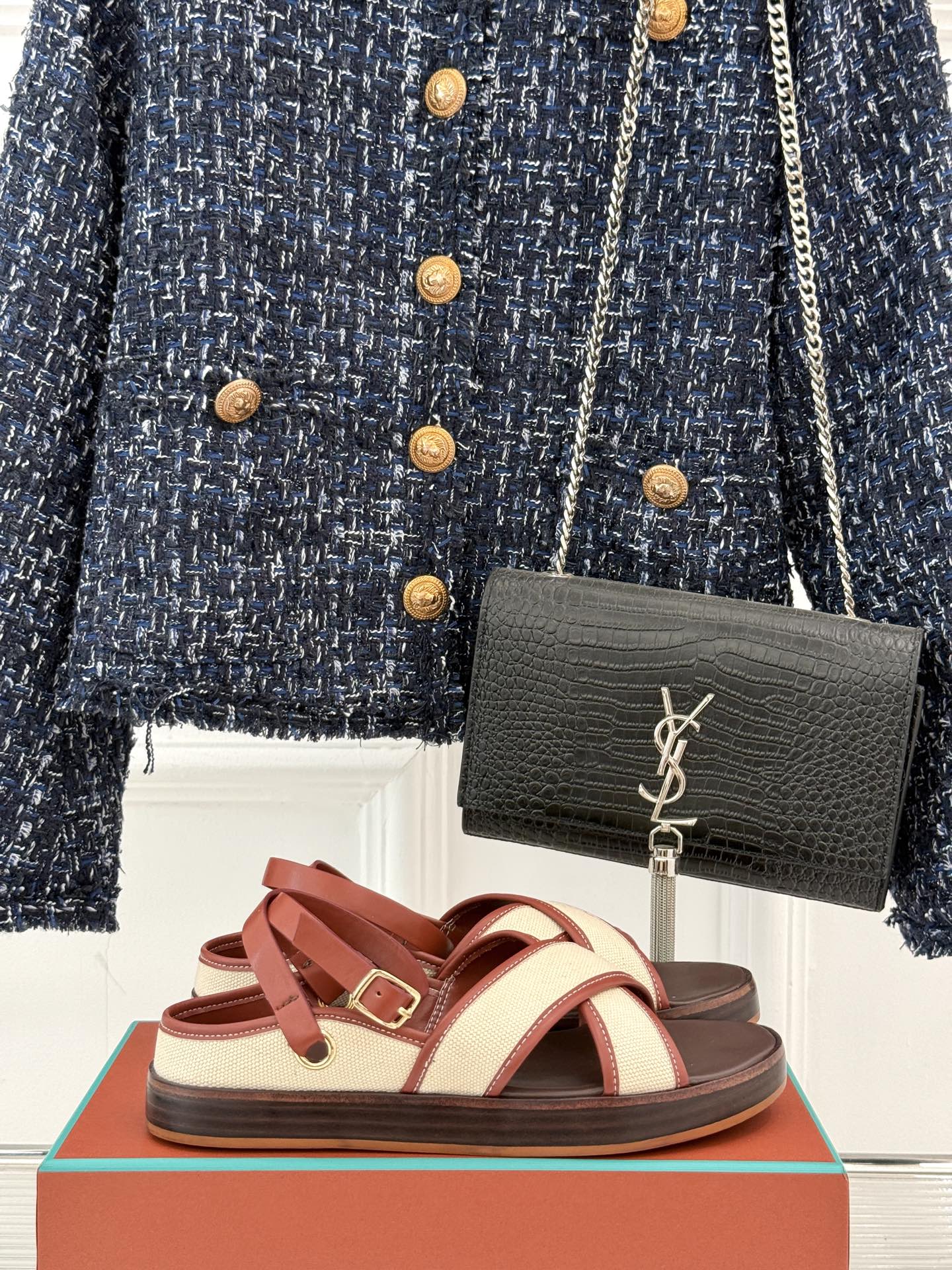 SANDALS THICK SOLE CROSS STRAP IN BEIGE FABRIC AND ORANGE CALFSKIN