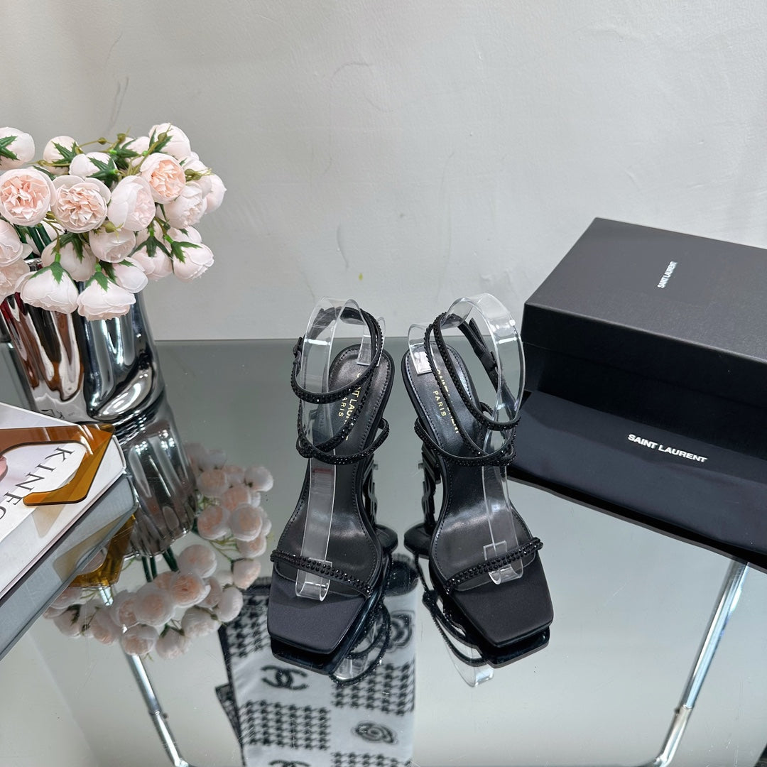 SL OPYUM CRYSTAL HEELED SANDALS BLACK SATIN