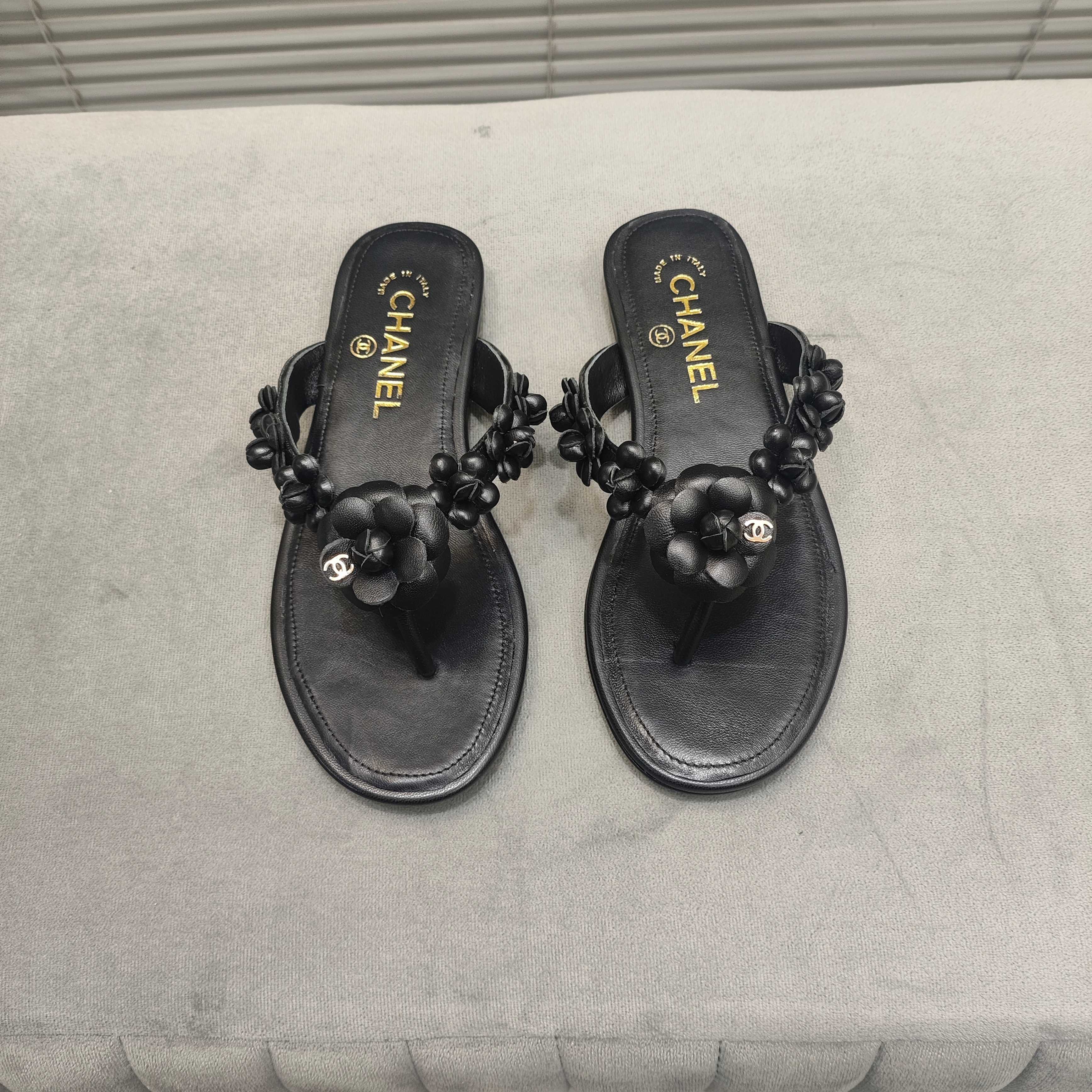 THONG SLIPPERS CAMELLIA IN BLACK SOFT LEATHER