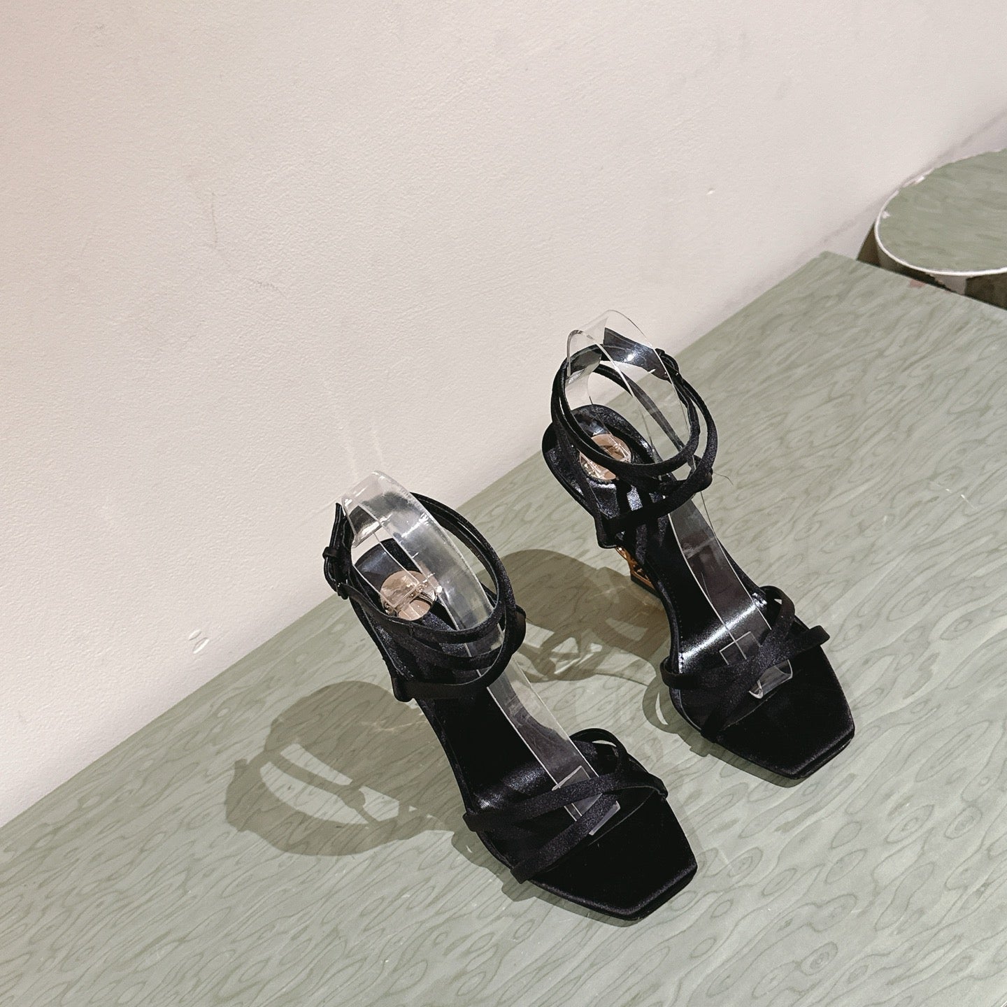 YSL 25S HIGH-HEEL SANDALS 100 MM IN BLACK SATIN WITH YSL LOGO HEEL DESIGN IN GOLD