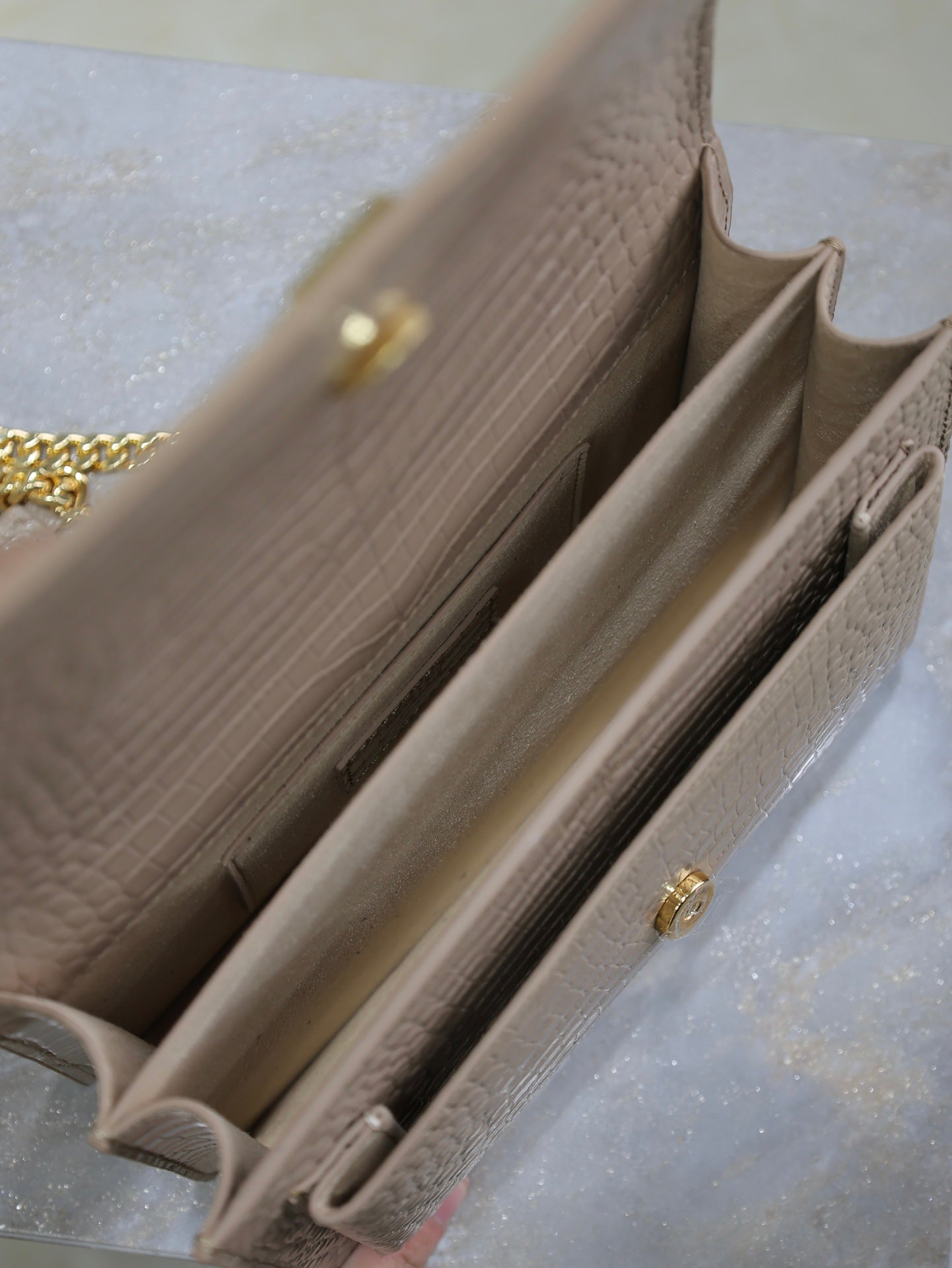 YSL 25S SUNSET MEDIUM 22 IN NUDE CROCODILE-EMBOSSED SHINY CALFSKIN GOLD HARDWARE